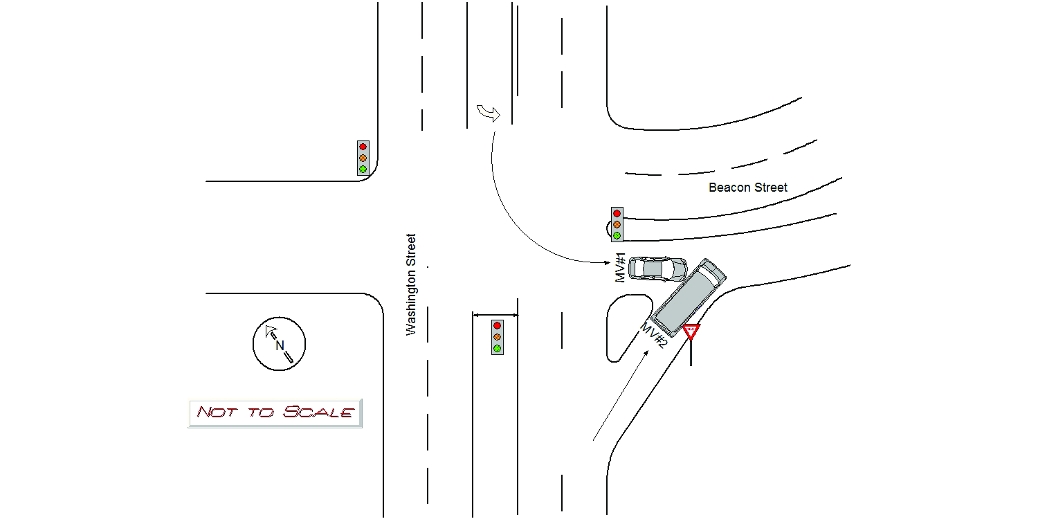 The OP. of MV#1 stated he was coming from the westbound lane of Washington Street, making a left turn on a green light to Beacon Street when he suddenly collided with MV#2. The OP. of MV#2 stated she was coming from the eastbound lane of Washington Street, observed a green light and proceeded to turn right onto Beacon Street when she suddenly collided with MV#1. Both parties stated they weren't injured but will seek medical attention if anything changes.