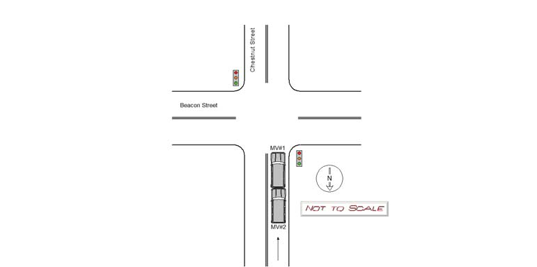 The OP. of MV#1 stated she was the first car stopped on the southbound lane of Chestnut Street by Beacon Street. She stated she was stopped at the red light for close to a minute before MV#2 collided into her rear. The OP. of MV#2 stated she was on the southbound lane of Chestnut Street, slowing down to a stop. While pressing on the brake, her vehicle just kept on sliding before colliding into the rear of MV#1.