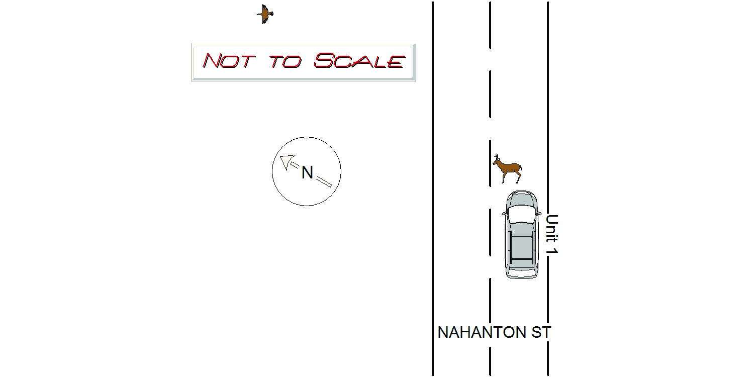 On Monday 10/25/2021 at approx 0941hrs, while assigned to N-498, I responded to the area of 455 Nahanton St for a single vehicle MVA. There, I observed MV1 pulled over on the side of the road facing EB. Operator of MV1 states she was traveling EB on Nahanton St and soon after crossing the bridge into Newton, a deer ran in front of her vehicle and collided with it. With little time to react and with wet road conditions she could not avoid striking the deer. It should be noted that the deer could not be located and was witnessed going back into Nahanton Woods. I observed that MV1 sustained a cracked front windshield and a broken driver side mirror. There was what appeared to be deer fur on the driver side door and mirror.