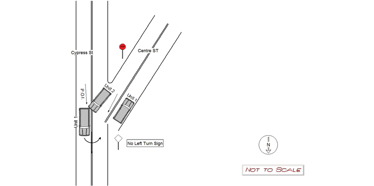 Vehicle #1 was traveling northbound on Cypress St where it turns into Centre St. Vehicle #2 was traveling northbound on Centre St. Vehicle #2 stopped at the stop sign at Centre St. and Cypress St. and attempted to merge with the traffic coming from Cypress St. when it collided with the rear end of Vehicle #1. The operator of Vehicle #2 stated the operator of Vehicle #1 slowed and attempted to take a left turn southbound onto Centre St. It should be noted there is a no left turn sign posted at the intersection of Centre and Cypress. Operator of Vehicle #1 stated that he was traveling northbound on Centre and did not attempt to take a left turn. Vehicle #1's final resting place was Southbound on Centre St. Vehicle #1 suffered minor damage to its rear end, it should be noted the operator of vehicle #1 was pulling the rear bumper of his vehicle upon arrival. Vehicle #2 suffered minor damage to it's front end. Both Vehicles were able to drive away from the scene and there were no injuries.