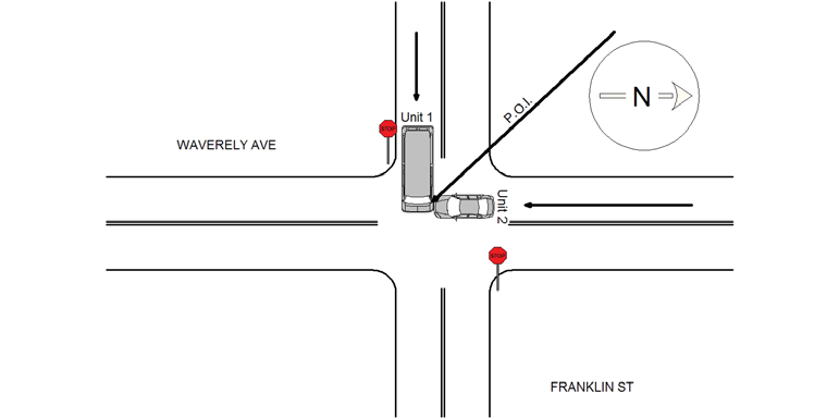 The operator of MV#1 stated she was traveling SouthBound on Waverely Ave when she was struck by MV#2 at the intersection of Franklin Street. The operator of MV#2 stated he was stopped on Franklin Street Eastbound at the stop sign. He then proceeded through to cross over Waverley Ave when he struck MV#1. The operator of MV#2 stated that his view was obstructed by a tree. It also should be noted that there are many motor vehicle accidents at this intersection based on there being no traffic signal making it difficult to cross. MV#1 had major Passenger side damage with airbag deployment. MV#2 had front end damage. The operators signed medical refusal's and Tody's towed MV#1.