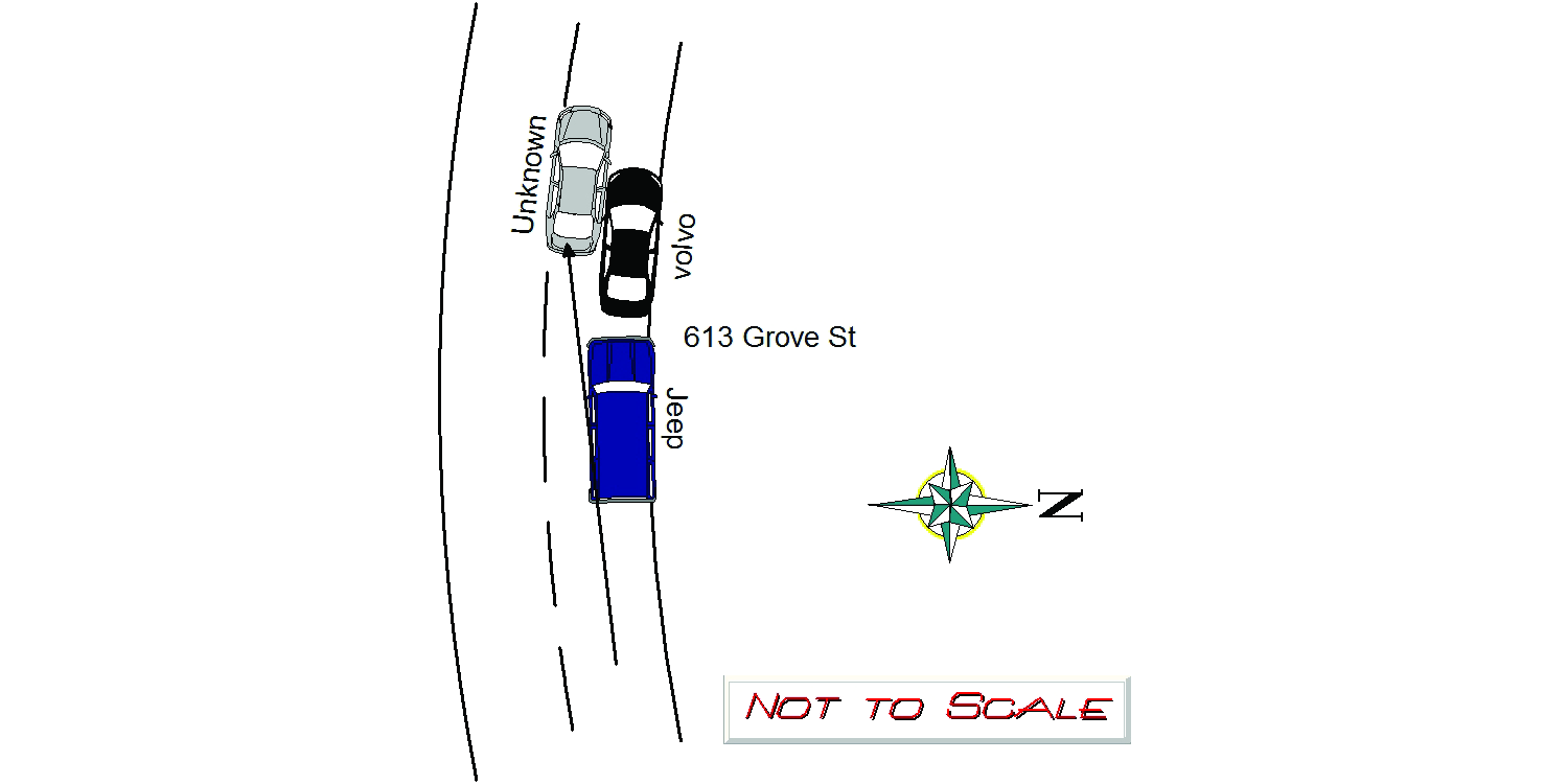 On 6/17/2021 at approx 1435hrs while assigned to 497 I responded to the area of 613 Grove St for a report of a past hit and run.Upon arrival I observed Ma Reg 7HX647 a 2013 black Volvo S80 with significant front left damage and Ma Reg 3PLF39 a 2004 blue Jeep Cherokee with significant rear left damage. It appears a vehicle travelling westbound on Grove St sideswiped both parked vehicles. I met with the owner of the Volvo ,Beverly DeWitt who stated she is a travelling hospice nurse and had parked at approx 1330hrs to see a client and upon returning found her car damaged. I spoke with the owner of the Jeep , Sabrina Visocchi who stated she had parked her vehicle at approx 2300hrs on 6/16/2021.The vehicles were parked on the westbound side with a high shrub row blocking the view from the house and the adjacent houses had no cameras or residents at home. The jeep was derivable, the owner of the Volvo had AAA pick up her car.