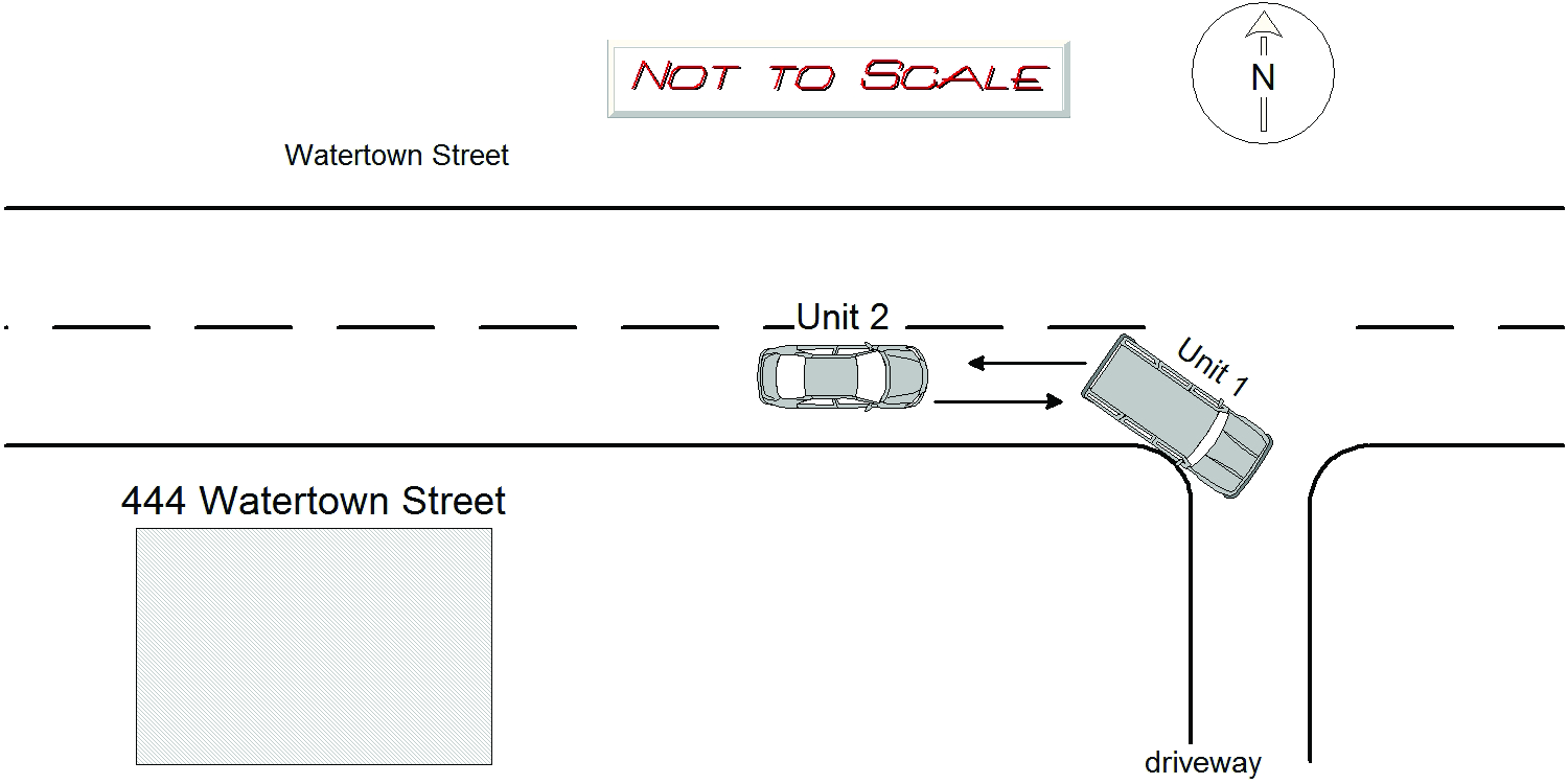 The operator of Veh # 1 stated she had fully backed out of the driveway to 444 Watertown Street when she was rear ended by Vehicle #2. The operator of Veh #2 stated Veh # 1 backed out of driveway into him. The damage to his car backs up this theory. He has a dash camera and is going to review footage. No Injuries Veh #2 got a private tow.