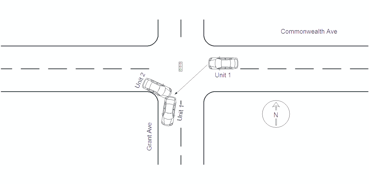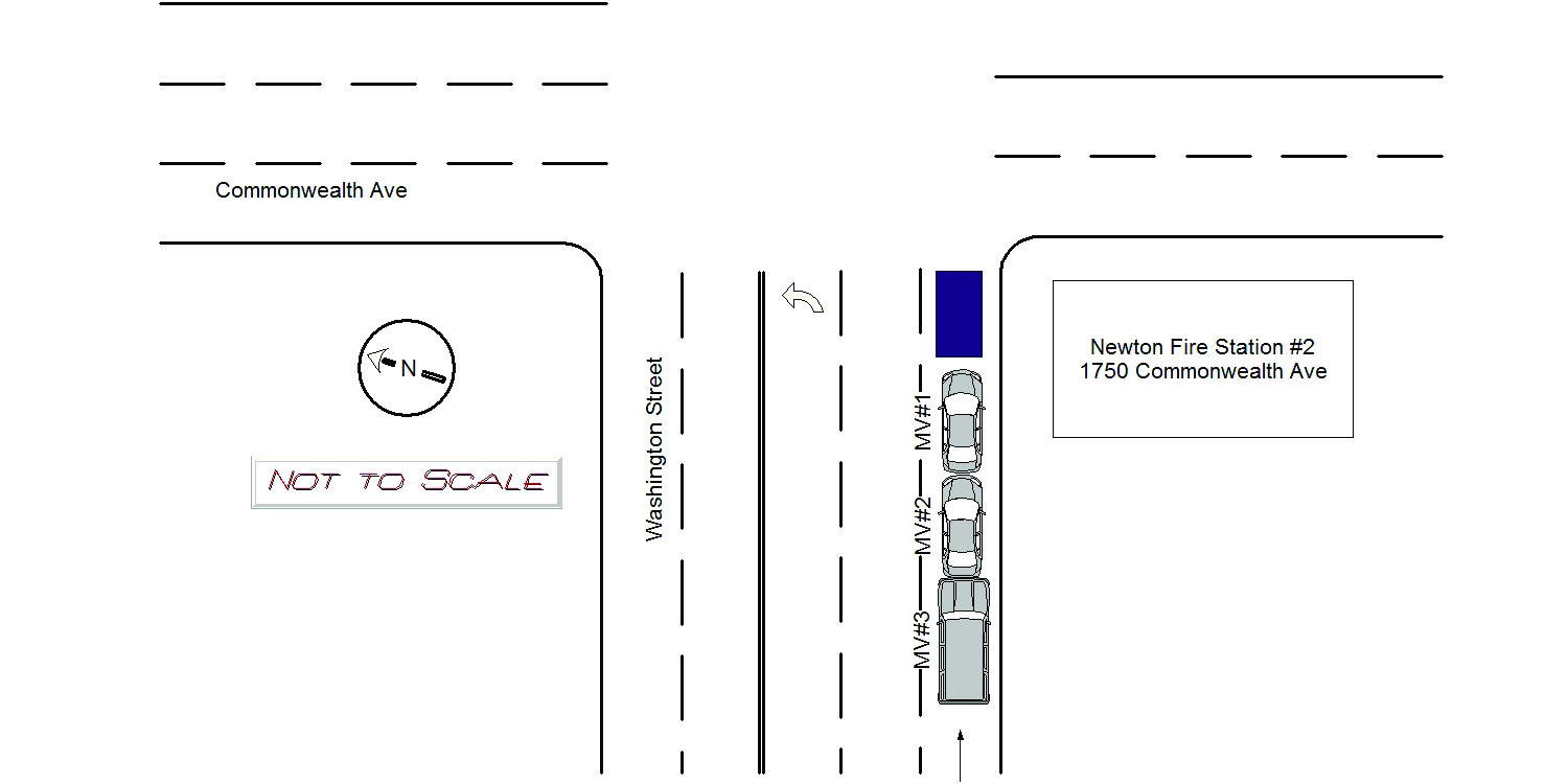 MV1 operator stated he was operating southbound on Grant Ave prior to Commonwealth Ave (both public ways ) and was attempting to travel straight through the intersection. MV1 operator stated MV3 (unknown white colored mini-van, driven by an unknown elderly white female) was operating northbound before Grant Ave, attempted to take a left onto Commonwealth Ave westbound. MV1 operator stated MV3 made the turn suddenly and did not yield the right of way to him, forcing him to swerve to avoid an accident with MV3. MV1 operator said because he had to swerve suddenly, the front end of his MV struck MV2 driver side which was stopped on Commonwealth Ave eastbound at Grant Ave. MV1 operator said MV3 was not struck and continued westbound on Commonwealth Ave. MV1 sustained heavy front end damage, and was towed by Tody's. MV1 operator reported no injuries at this time. MV2 operator stated she was stopped on Commonwealth Ave eastbound at Grant Ave. MV2 operator's story collaborated with MV1's story. MV2 operator said she witnessed MV3 suddenly cut off MV1 by taking a sharp left at the intersection, failing to yield the right of way to MV1. MV2 operator stated because MV1 had attempted to avoid a MVA with MV3, MV2's driver side was struck by MV1. MV2 sustained heavy driver side damage, and was towed by Todys. MV2 passenger was an infant that was checked by medics and appeared to be uninjured at this time, MV2 operator stated she struck her head on the driver side window and was transported to Newton-Wellesley Hospital for an evaluation. MV3 was unlocated at this time. Photos of the accident were taken and forwarded to the I.T. Bureau.
